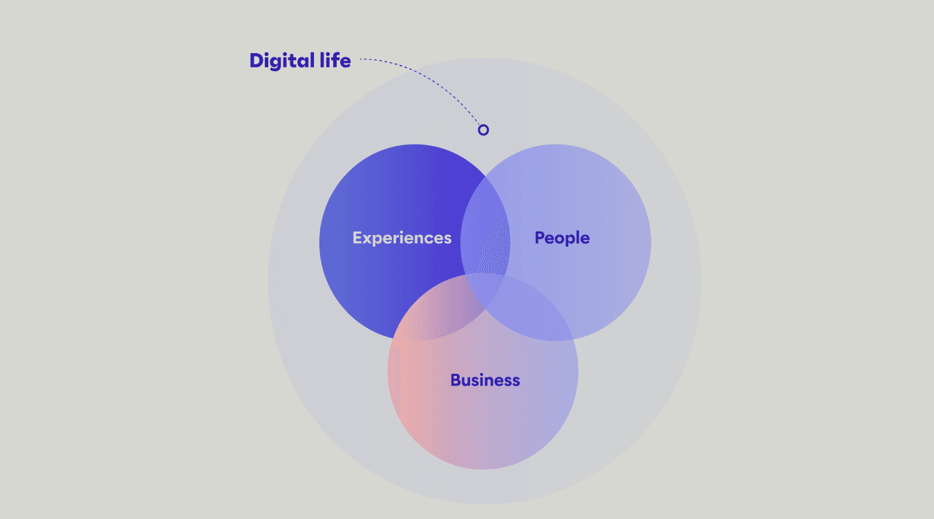 Le modèle "Digital Life Centricity" englobe tquatre dimensions spécifiques—Experiences, Business, et People—tout en étant ancré dans la compréhension globale de l'évolution numérique de la société à travers la dimension principale "Digital Life". Cette intégration assure que toutes les stratégies sont pertinentes et adaptées aux tendances actuelles.