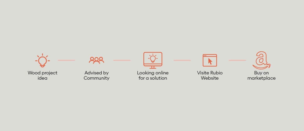 Parmi les différentes cibles, nous en avons identifié une, les "Wood-lovers", qui aime le travail du bois, et qui s’intéresse plus en détails aux différents produits. Cette cible s’appuie sur des communautés en ligne afin d'en découvrir plus sur le sujet. Elle se rend ensuite sur différentes plateformes digitales afin de mieux comprendre tous les détails, pour enfin acheter sur les marketplaces.