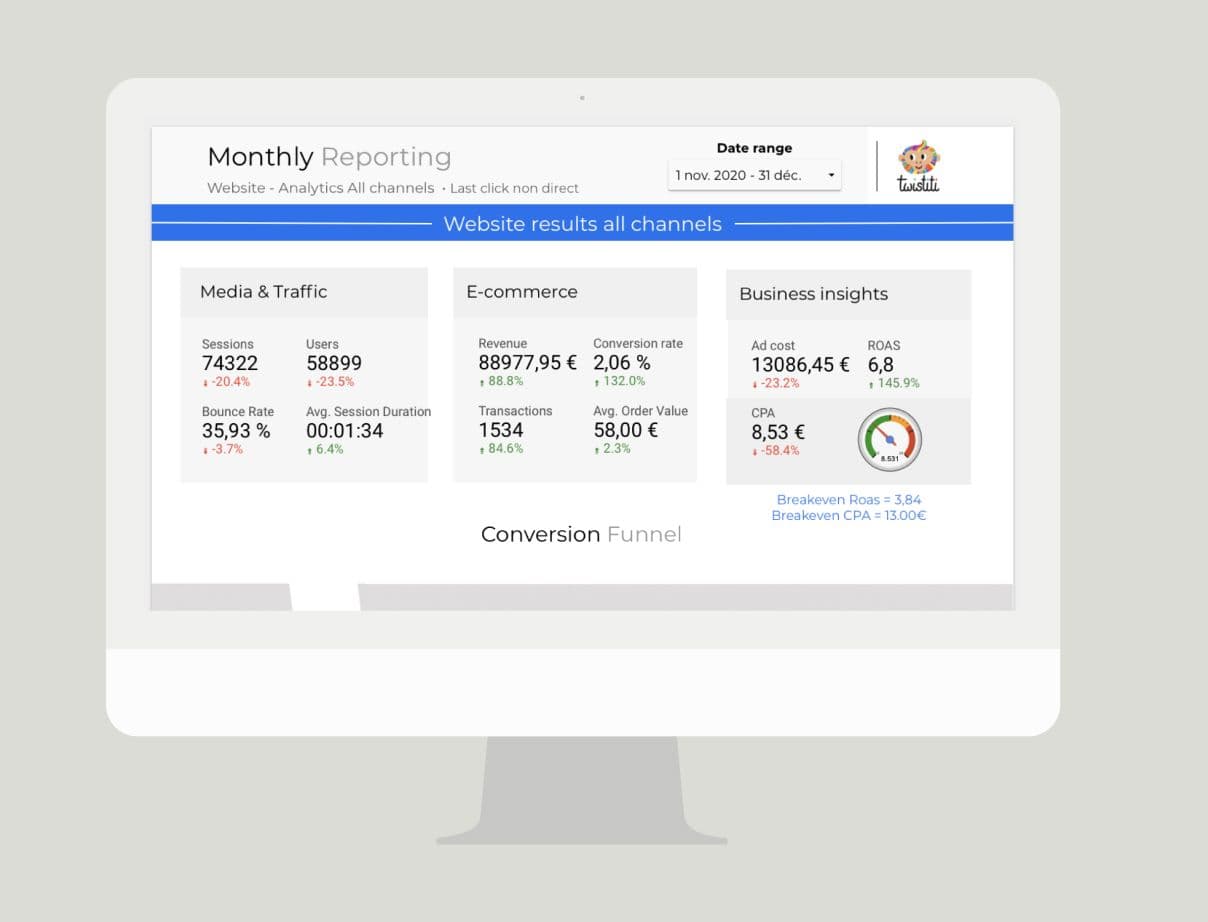 Un outil de dashboard nous permet de piloter les campagnes digitales et leurs performances. Cet outil permet de gérer les performances business de l’entreprise et adapter les campagnes digitales.